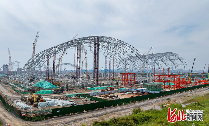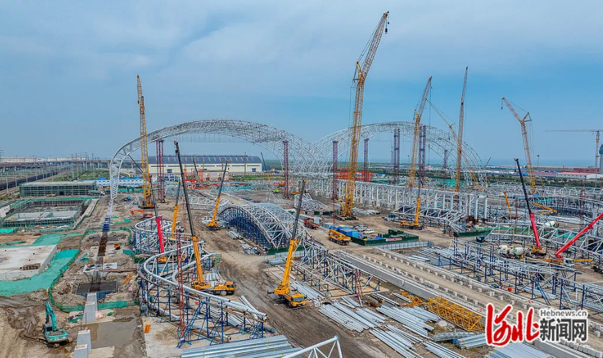 9月21日,曹妃甸矿石储运物流项目建设现场,工人们正在进行料棚搭建。 曹妃甸矿石储运物流项目 总投资约18.4亿元 工程主要建设2座全封闭条形料棚 最大跨度为180m 结构采用预应力钢管桁架拱结构 围护结构采用膜光伏一体化板形式 其结构形式为国内首创 实现了环保封闭、能源利用 与空间优化的多重目标 工程建成后 将大大增强曹妃甸港区铁矿石储运能力。