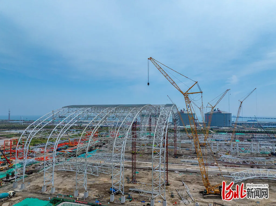 9月21日,曹妃甸矿石储运物流项目建设现场,工人们正在进行料棚搭建