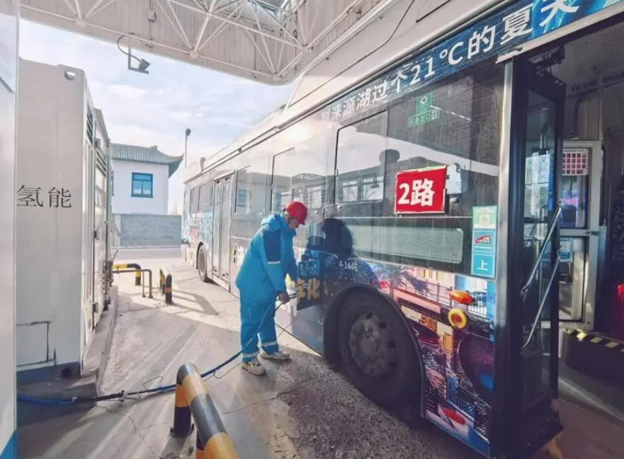 1月4日,在张家口市交投氢能新能源科技有限公司创坝加氢站,工作人员正在给公交车加氢。 河北日报记者 刘雅静摄
