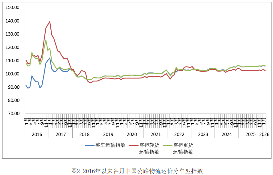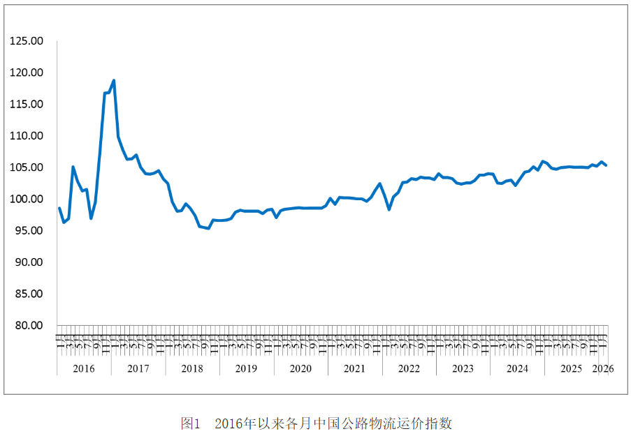 2026年2月份,由中国物流与采购联合会和林安物流集团联合调查的中国公路物流运价指数为105.3点,环比回落0.54%,同比去年回升0.46%。从月内看,第一、四周运价指数环比回落,第二、三周运价指数环比回升。