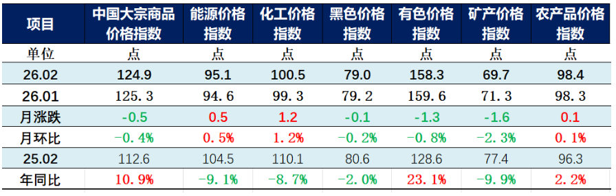 由中物联大宗商品流通分会和上海钢联等单位联合调查,中国物流与采购联合会发布的2026年2月份中国大宗商品价格指数(CBPI)为124.9点,环比下跌0.4%,同比上涨10.9%。从指数运行情况来看,受春节假期影响,环比略有回落,但同比保持近年来较大涨幅,表明大宗商品市场总体运行平稳,市场预期向好的基本趋势和内生动力依然稳固。随节后各行业全面复工复产,以及投资和消费需求释放,市场有望逐步回暖,企稳回升。但当前国际形势复杂多变,金融市场动荡加剧,部分行业需求不足问题仍比较突出,维护大宗商品市场平稳运行,需进一步加强对能源、化工和有色金属等大宗商品的外部输入性风险研判与管控,实施更加积极主动的宏观调控政策。
