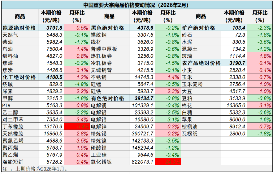 从国内外指数比较看:CBPI与上月PPI、CPI走势基本一致。1月PPI环比上涨0.4%;其中,生产资料价格环比上涨0.5%,生活资料价格环比上涨0.1%。1月CPI环比上涨0.2%;其中,食品价格环比持平、非食品价格环比上涨0.2%。CBPI与CRB环比下跌、S&P GSCI上涨。中东地缘政治局势持续紧张,加剧全球能源、化工、金属等相关大宗商品价格波动。2月,美国总统特朗普在最高法院裁定其原有关税政策违法后,转而依据《1974年贸易法》对所有国家和地区商品加征15%的全球进口关税,亦引发全球经济下滑和通胀担忧。