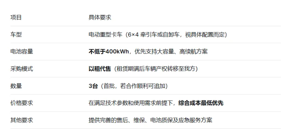 秦皇岛个人因业务发展需要,计划引入新能源电动重卡,用于厂区及周边短途运输。为降低初期投入成本、提高资金使用效率,现拟采用 “以租代售”模式 采购车辆,诚邀具备相关资质和丰富经验的供应商提供方案及报价。